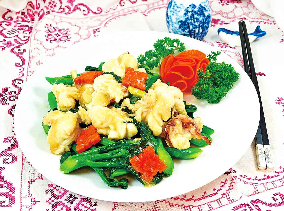 4.熱鍋下1湯匙油,放入龍蝦球,中火輕炒至8成熟,盛出。