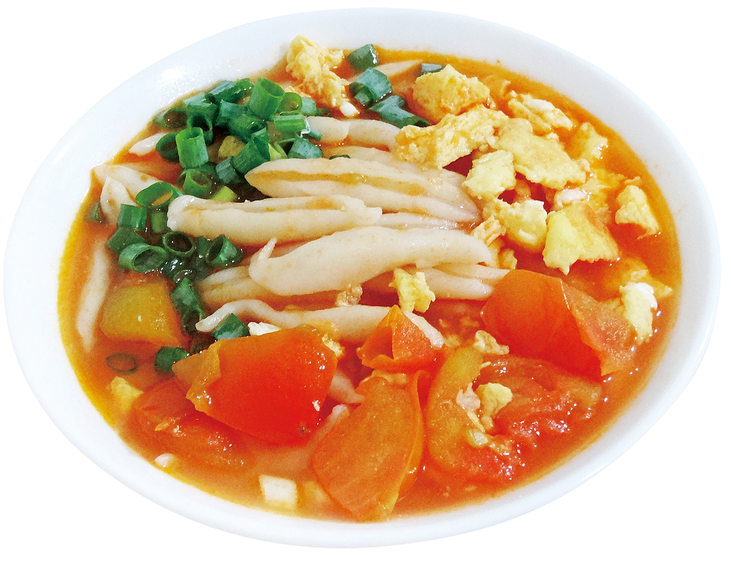 5.炒蛋後,放進番茄拌炒調味,倒入高湯煮沸,再放入煮熟的剪刀麵煮一會兒,即可起鍋盛碗,最後撒上蔥花即完成。◇