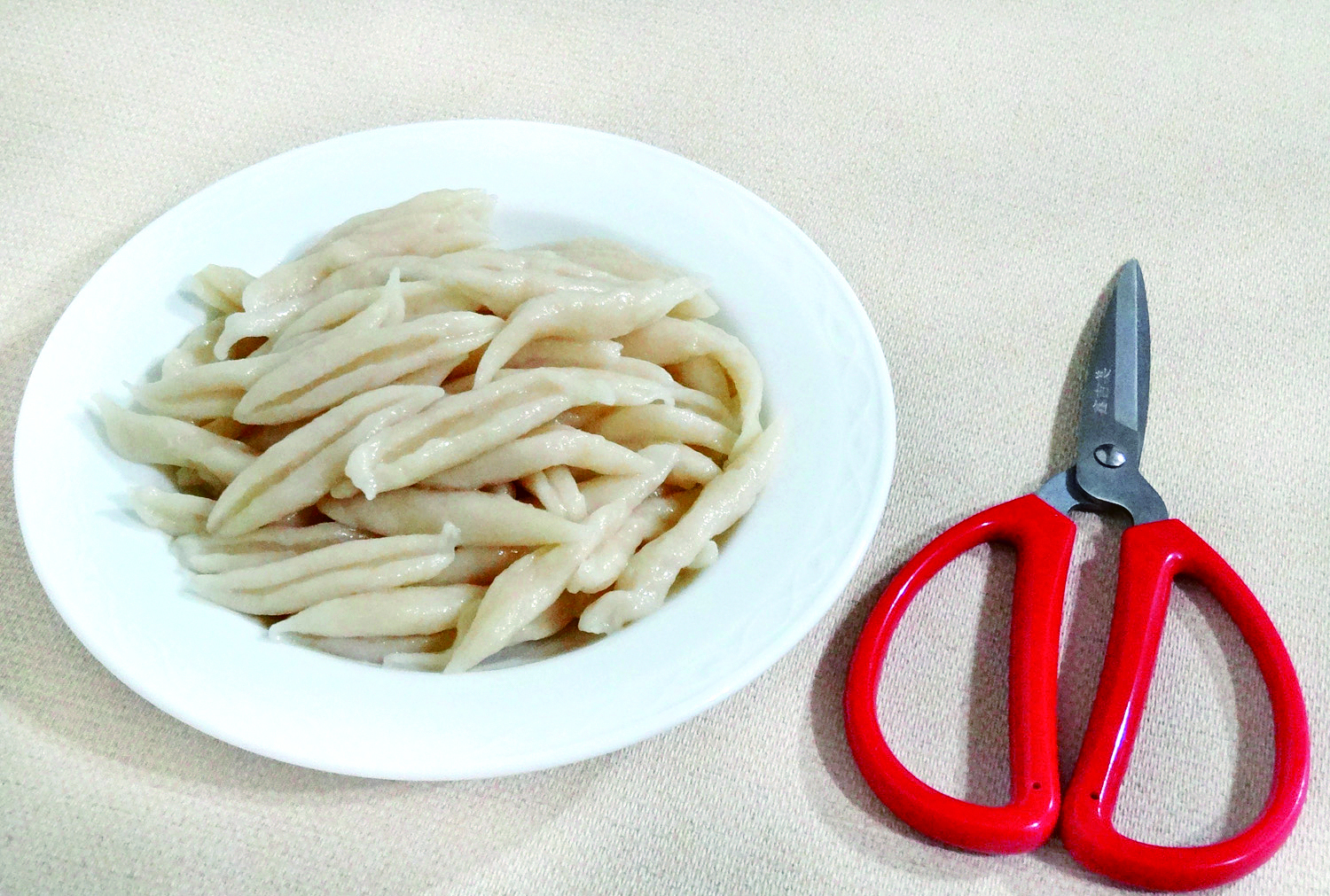 3.麵團尖部沾些麵粉,一手握住麵團,一手拿廚房專用的剪刀,從頭邊轉圈,邊用剪刀把麵剪下,剪成兩頭尖,中間胖的小魚兒形狀。