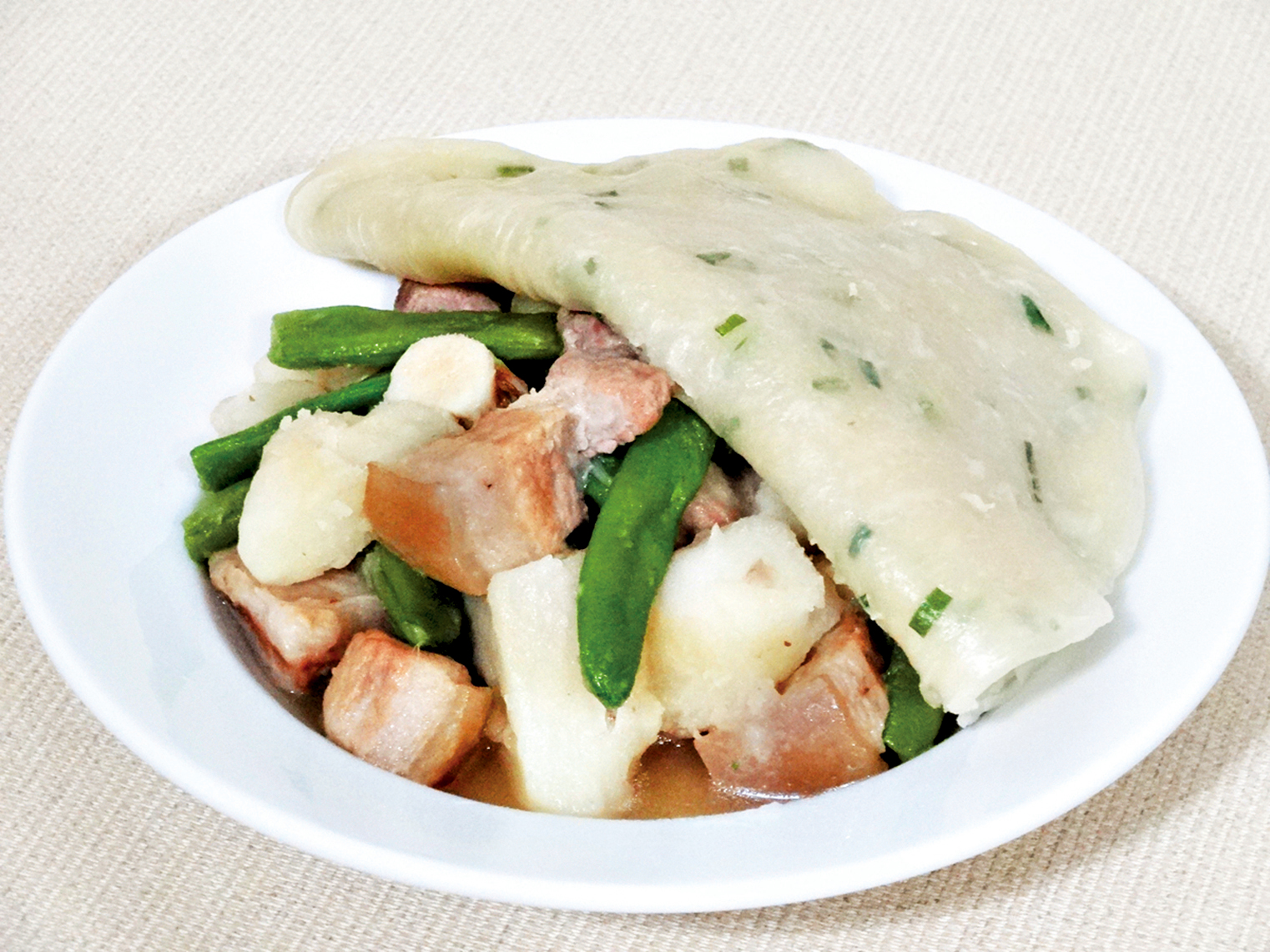 「烀(ㄏㄨ)餅」是東北的名菜,已有三百多年的歷史,因它可當主食也可當菜吃,所以是非常受歡迎的家常菜。「烀」就是指用適量的水,蓋緊鍋蓋,半蒸半煮,把食物弄熟之意。所以烀餅是一種既省時又省能源的美食佳餚。