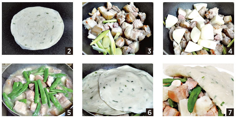 6.將擀好的餅皮蓋在肉菜上,使其燜燒。