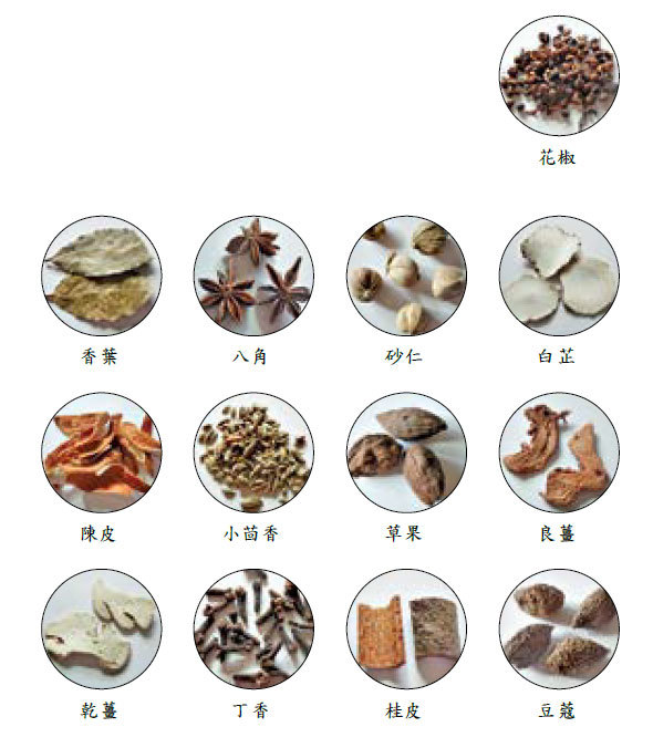 十三香(將花椒、香葉、陳皮、乾薑、八角、小茴香、丁香、砂仁、草果、桂皮、白芷、良薑、豆蔻裝入小布包)。
