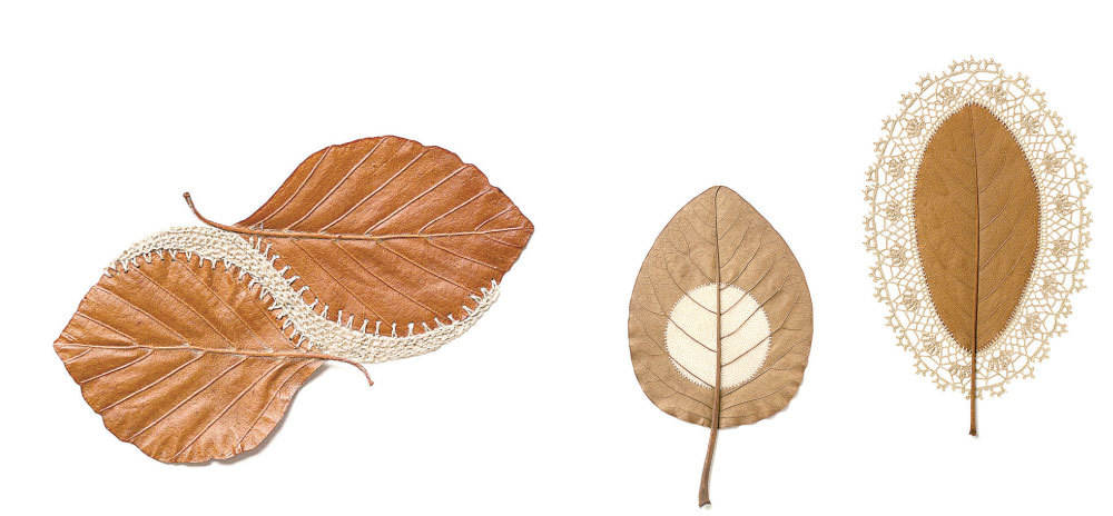 她突發奇想,將自然界中一文不名的葉子、木枝、石子與手工編織相結合,用鉤針在葉子上大膽創作,除了各種幾何圖形,還有三維立體方塊、圓柱、蛛網等造型;不起眼的天然雜物由此彰顯出靈性,變身細節精微、格調靜雅的藝術品。
