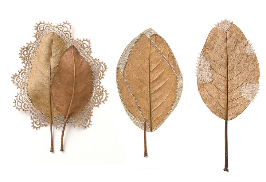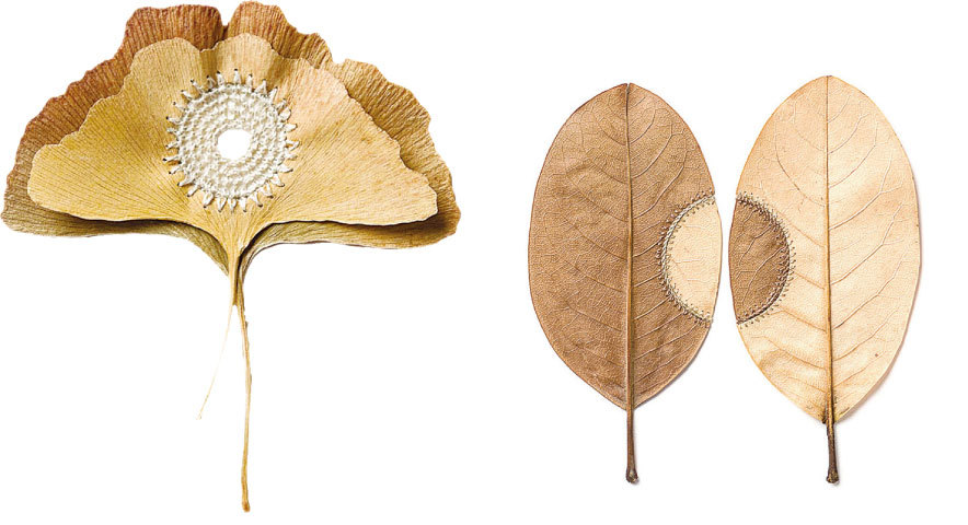 她視每一片枯葉如珍寶,她花很多時間與各種葉子「溝通」,觸摸它們的紋理,聆聽它們的心聲,掌握每片葉子受力的極限,小心翼翼地用質樸的細密針線進行創作。