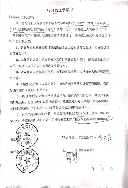 據崔福芳說,當時為了舉辦世博會,政府也承諾了不強遷一戶人家,安置達到每一個人,世博局也寫了承諾書的。但事實上並沒有這樣做。#