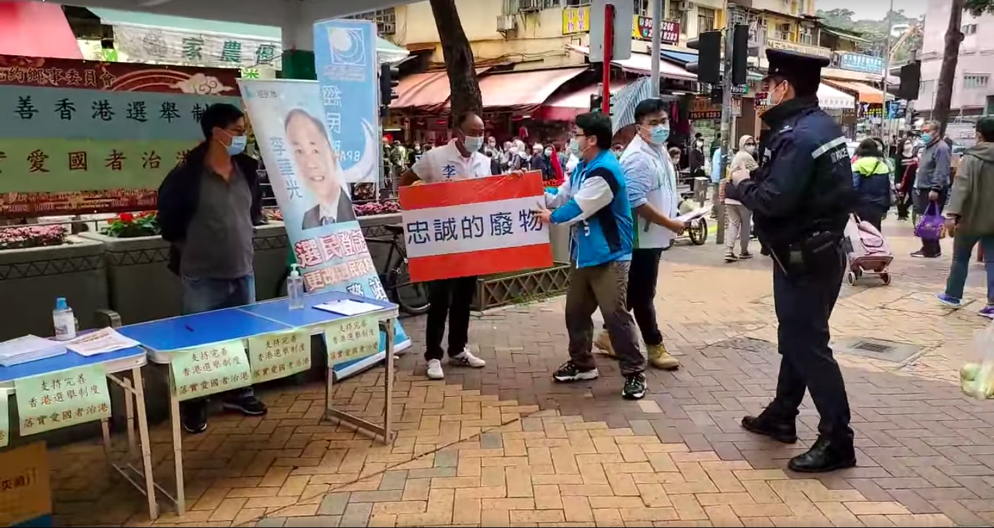 林名溢在街站說,紙牌很適合形容經民聯李光華的街站,邀請義工與紙牌合照。林還逐個問街站義工:「你要唔要?」李華光及義工喝斥林,警員抄下林身分證明文件。離開後,林名溢稱設街站者「明明是少數,又是廢物,但又不承認;廣大的市民都認為他們是廢物」。@