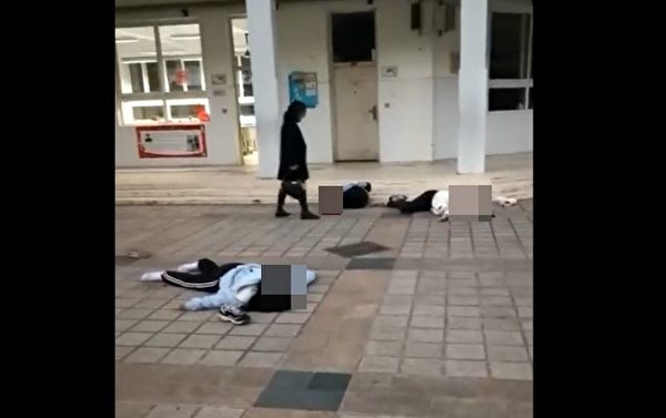 根據網傳的影片顯示,有三名女學生趴在地上,有一個穿黑衣服的女子在看學生的狀況。