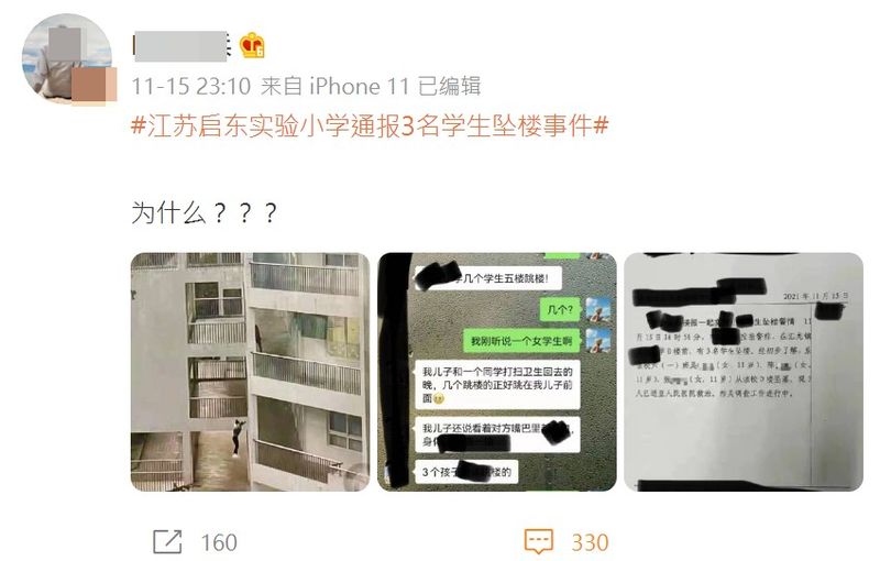 11月15日晚,江蘇啟東實驗小學通報稱,當日下午4時57分左右,該校有3名學生發生墜樓事件。目前,3名學生生命體徵基本平穩。