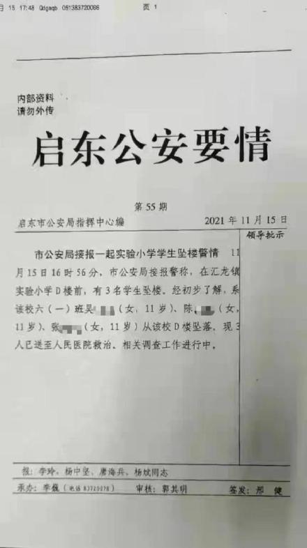根據網絡傳出的「啟東公安要情」稱,15日16時56分,該局接到報警稱,在匯龍鎮實驗小學D樓前,有3名學生墜樓。系該校六(一)班吳某某(女,11歲)、陳某某(女,11歲)、張某某(女,11歲)從該校D樓墜落,現3人已送醫救治。