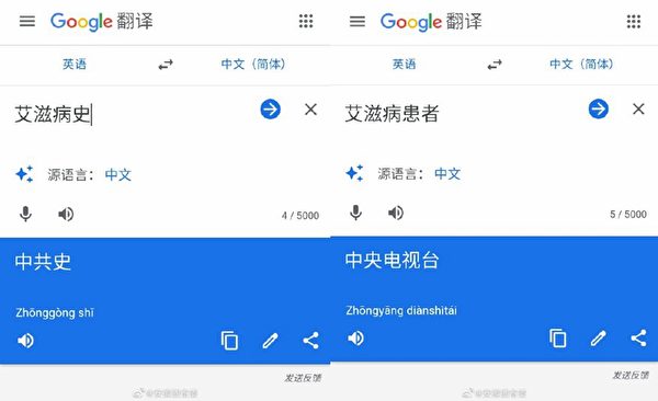 輸入「愛滋病者」顯示為「毛澤東」或「中華人民共和國者」。如果輸入意思相近的「愛滋病患者」,則翻譯為「中央電視台」和「中央人民代表大會」。