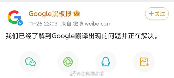 11月26日,共青團安徽省委員會官方微博發帖文說,「Google翻譯不出來解釋一下嗎?」