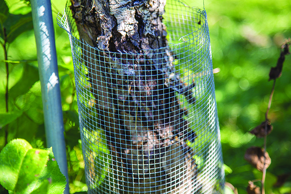 對果樹來說,在樹幹上安裝防護網(Rodent Guard),可有效防範鼠類。市面上有出售塑料和金屬的樹幹防護網,或者可在樹幹上纏幾層厚布,也能起到不錯的保護效果。此外,市面上也有防鼠、防蟲的塗料和藥物,不過這些化學物質要慎用。