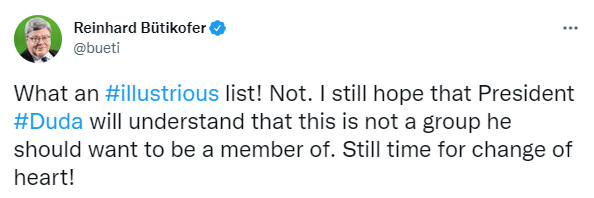 來自德國的歐洲議會議員比蒂科夫(Reinhard Butikofer)也發推文諷刺說,「多麼『輝煌』的名單啊!」同時他還喊話波蘭總統,我仍然希望杜達總統能夠明白,這不是你應該去湊的局,你還有時間改變主意。