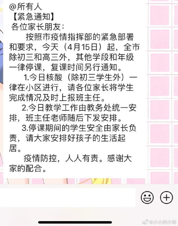 4月15日,陝西西安市多區縣家長接到停課通知,網傳通知顯示,西安全市中小學停課。西安全市全員核酸檢測。陝西西鹹新區灃東新城自4月14日晚上10點起全域封閉管理。