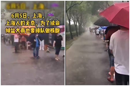 6月5日,上海人在傾盆大雨中撐著傘,排著很長的隊伍等待做核酸檢測,這一幕被網民拍錄下來。除了心累、身體累之外,很多人擔心排長隊聚集做核酸會造成感染。
