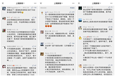 該文章獲得不少網民的回應:「我們社區附近一百米不到的核酸檢測點,今天上午排了近兩小時才輪到我。」「晚飯後因明天我們的保質期要過了(72小時核酸)去做下核酸。我們走了附近三個檢測點都排隊,沒有一個小時輪不到檢測。想出來的專家們真有辦法,這樣聚集排隊就不怕感染了嗎?」