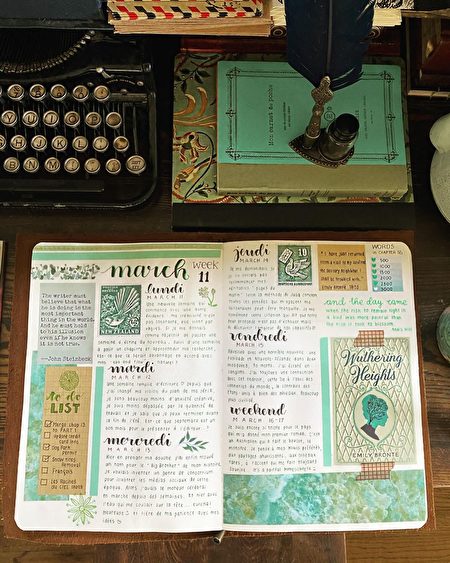 「我喜歡把每一頁做得都不同。對我來說,這是很好的冥想方式。」她說,「我的日記裏有很多經典的繪畫,還有復古的植物插圖。我覺得加入這種視覺元素有助於挖掘自己內心未知的領域。」