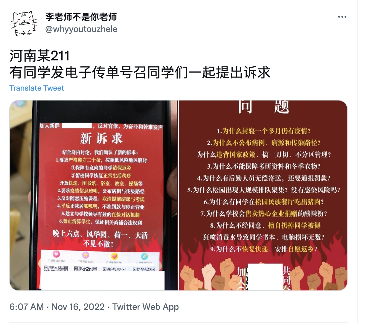 在河南一所211大學,有同學發電子傳單號召同學們一起提出訴求。
