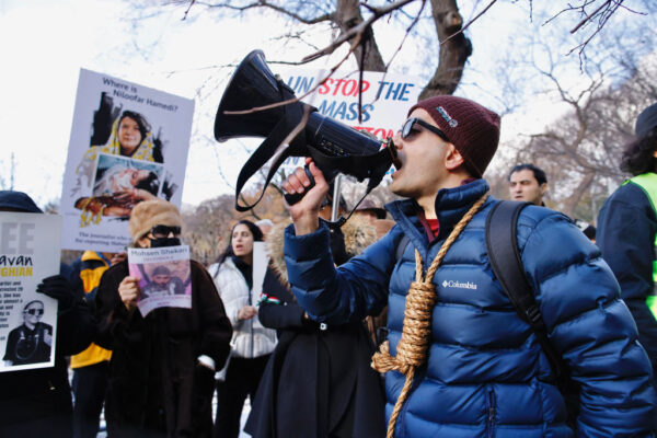 2022年12月17日,人們在紐約市的伊朗常駐聯合國代表團前抗議伊朗的處決和拘留。 (KENA BETANCUR/AFP via Getty Images)