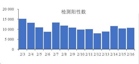 中共疾控中心展示了從2月3日至2月16日的近期陽性患者數據圖,顯示數據變化波動並不大,並未體現明顯下降的趨勢。圖中顯示,2月12日的檢測陽性數似乎最低,但之後又開始上升,
