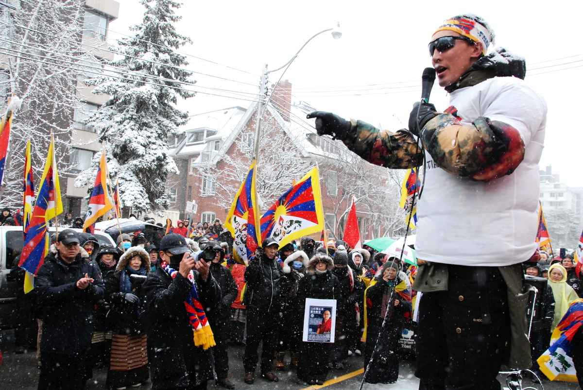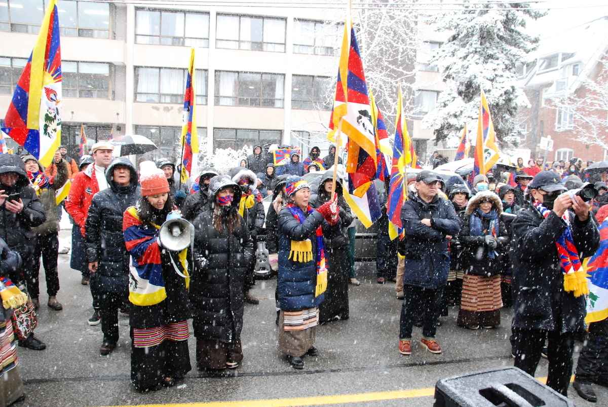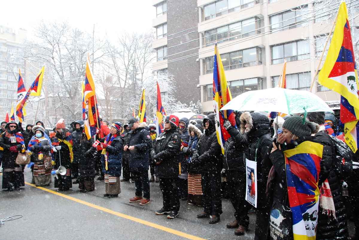 抗議人士從馬薩里克考恩公園(Masaryk-Cowan Park)出發,歷時1個小時,遊行到中共政府駐多倫多總領事館前,繼續集會活動。現場人士高喊:「停止殺戮、停止迫害」、「自由西藏」、「中共恥辱)等口號,譴責中共當局數十年來剝奪藏人基本人權。