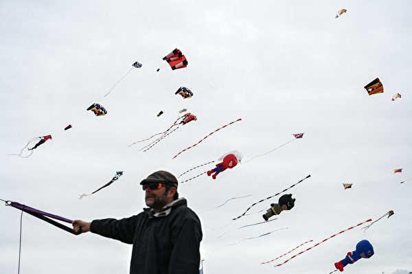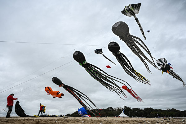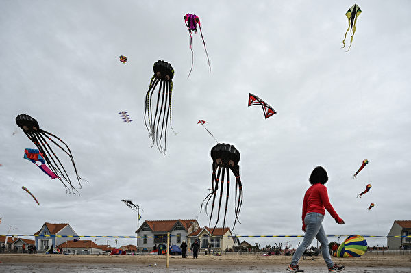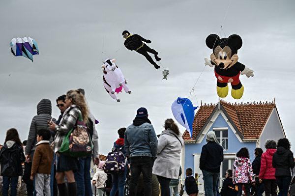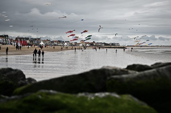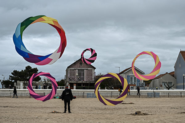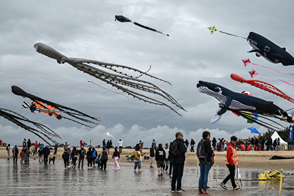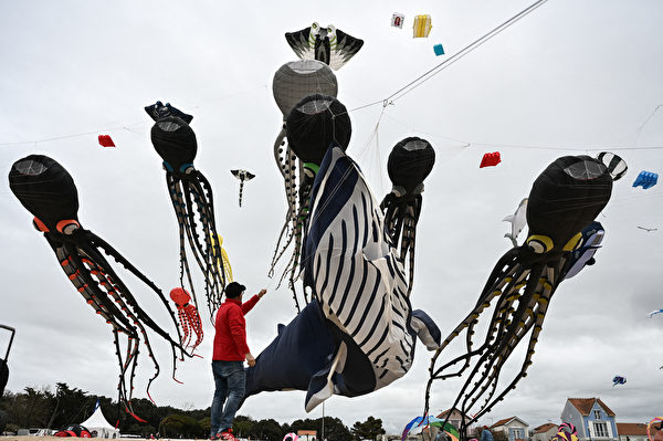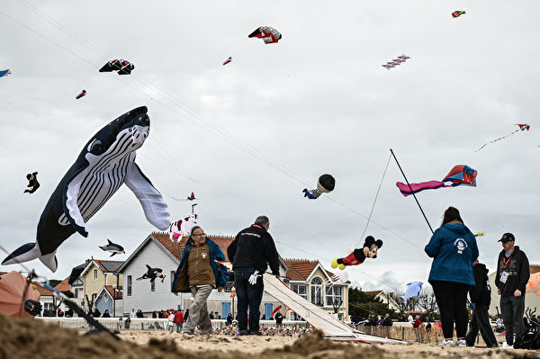 2023年4月10日,法國沙泰拉永普拉日(Chatelaillon-Plage),來自法國各地和國外的風箏愛好者在第29屆國際風箏節期間放風箏。(Philippe Lopez/AFP)