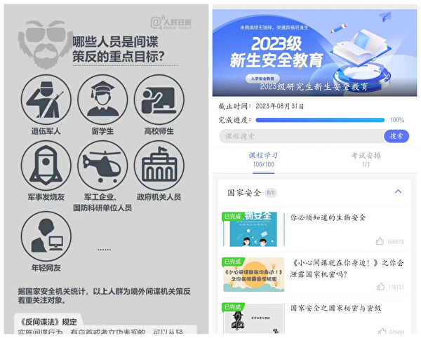 《反間諜法》於2014年11月1日公佈施行。修訂後的新版《反間諜法》於2023年7月1日正式實施。任女士透露,大約2015年,高校要求輔導員一手一本。不僅新生教育要進行反間諜宣傳,每學期都有,還得答題,正確率必須80%以上才能通過考試。