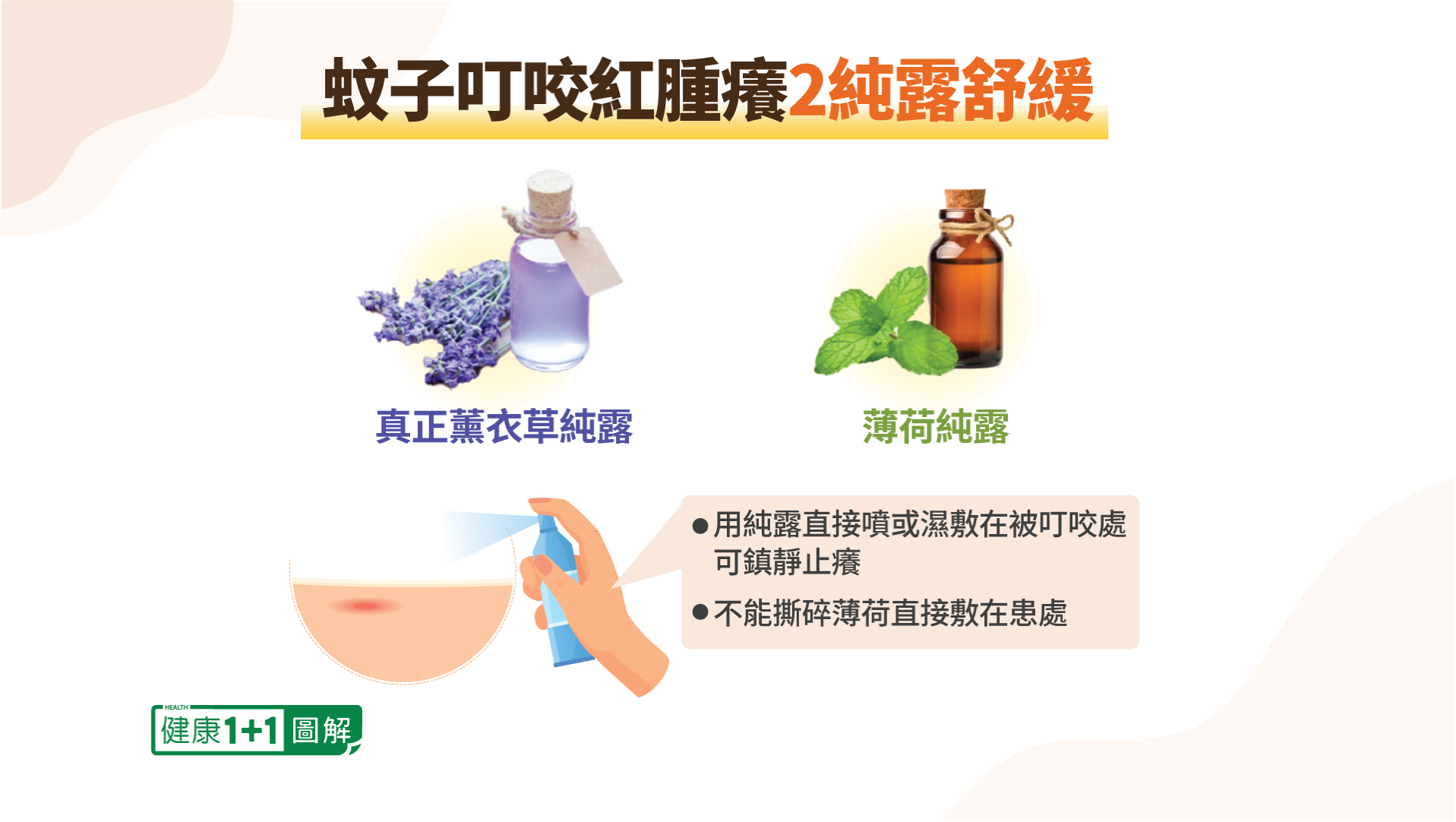 郭姿均表示,最好採用真正薰衣草純露和薄荷純露來止癢,它們都是蚊蟲不喜歡的味道,具有驅蚊蟲及止癢效果。純露是萃取植物精油時產生的揮發物,純露裏面的精油分子約佔0.02%,溫和不刺激,可以直接噴在皮膚上。