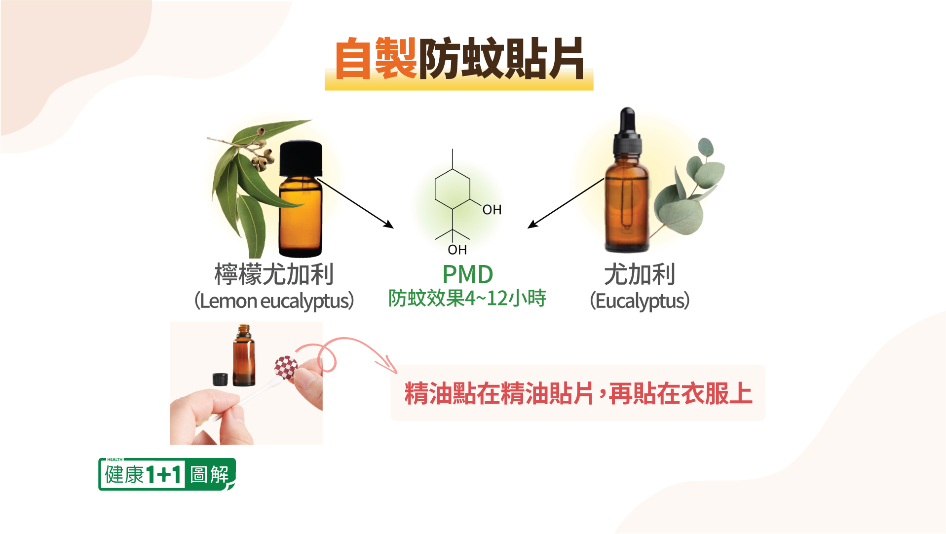 郭姿均建議, 可以購買檸檬尤加利及尤加利,單獨或混合後滴在精油貼片上,然後把貼片貼在衣服上來防蚊,可以反覆使用一個星期。