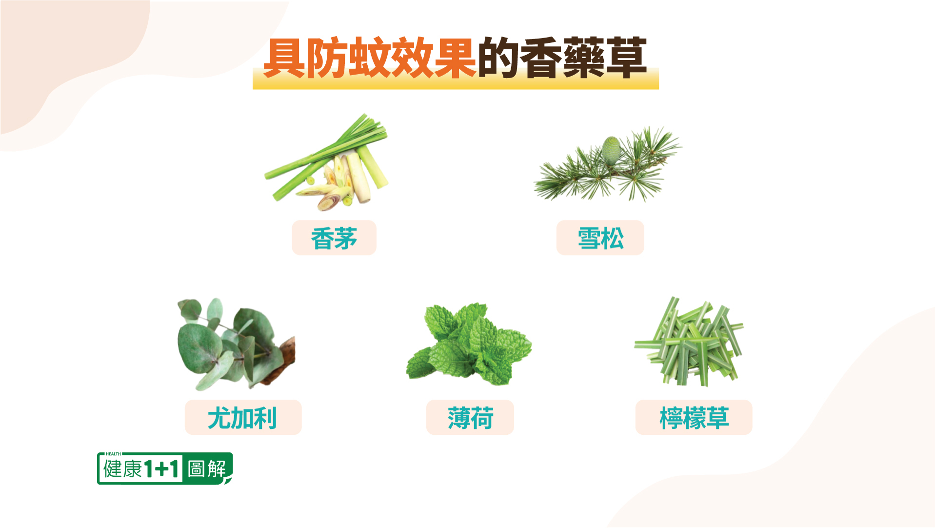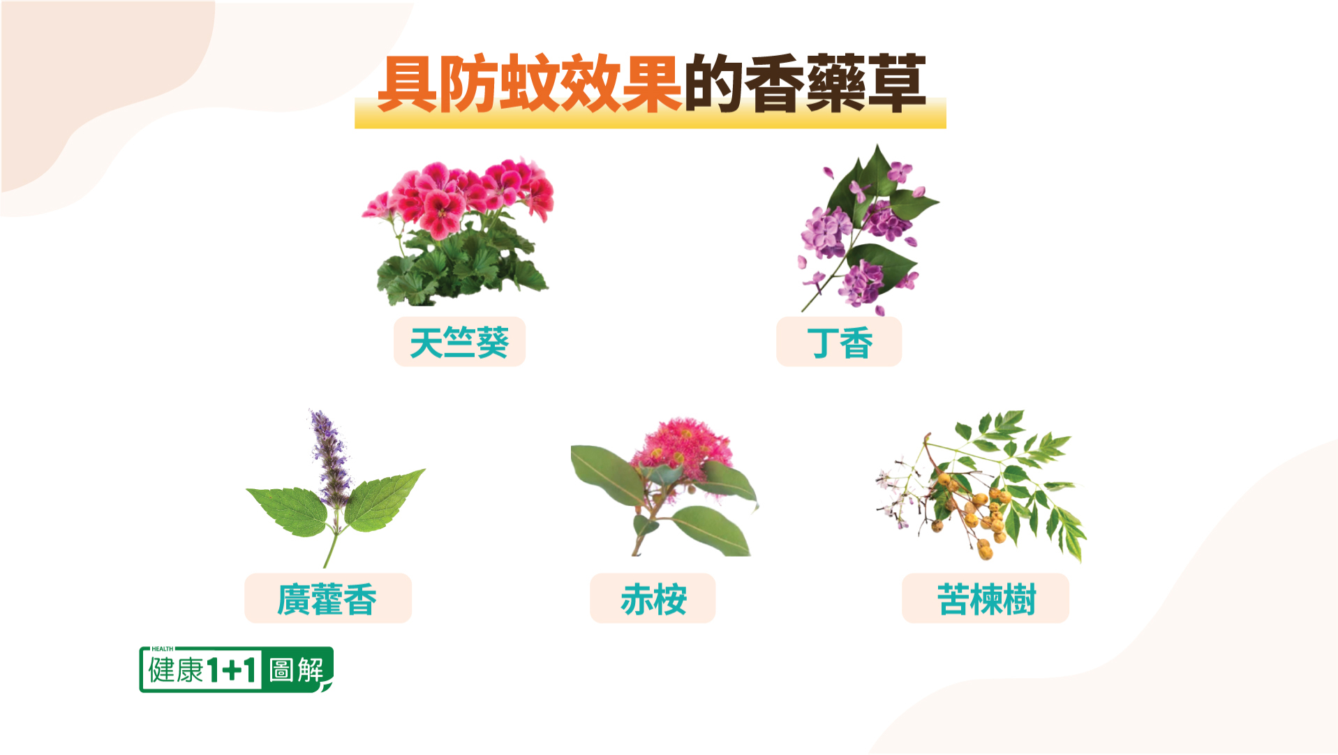 她表示,具有防蚊效果的香藥草還包括香茅、薄荷、檸檬草、雪松、丁香、苦楝樹、廣藿香、天竺葵等。