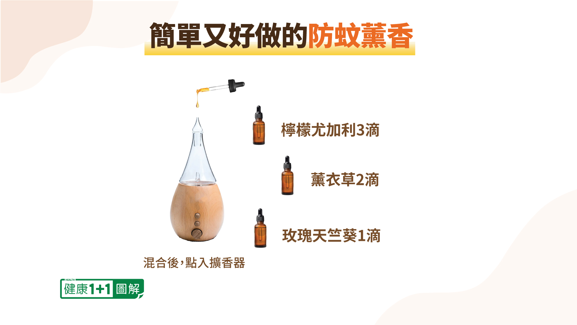 至於夏天的防蚊方法,郭姿均推薦可以自製防蚊薰香。做法是向薰香器中加入檸檬尤加利精油3滴、薰衣草精油2滴、玫瑰天竺葵精油1滴。這個配方除了能夠防蚊外,味道也非常好聞,並且針對經前症候群或更年期的人,還可增加安眠效果。