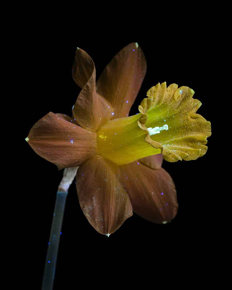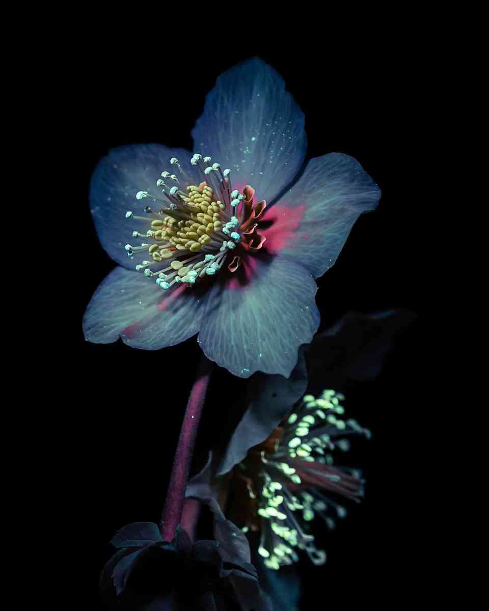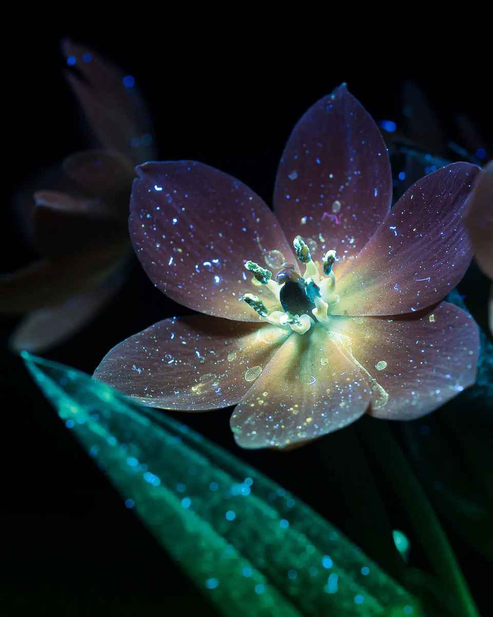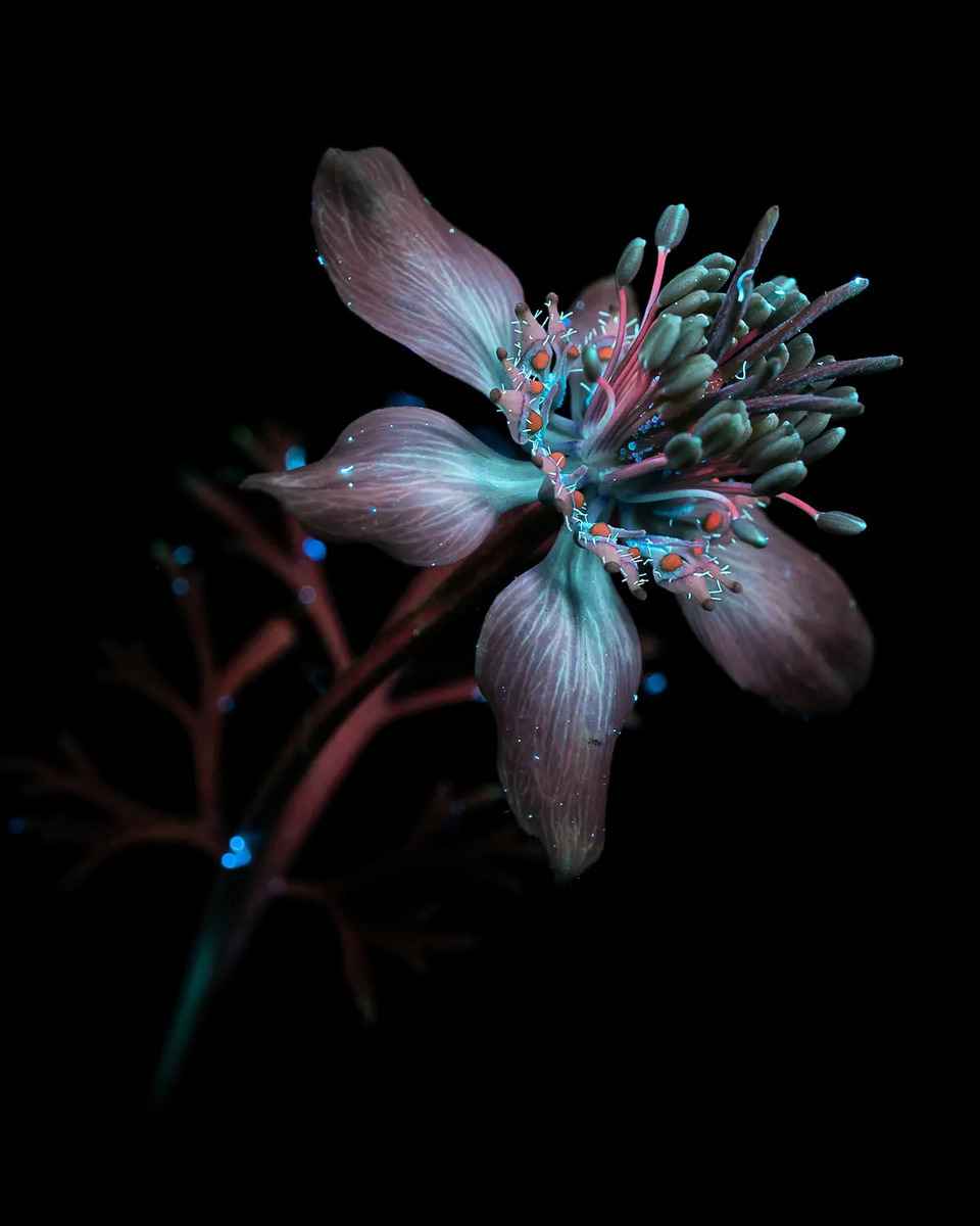 「每個鏡頭都是獨一無二的」,她說,「因為用紫外線手電筒照向花朵時,每次的角度不可能完全一致,而且每次拍攝時的光影效果也不同。」