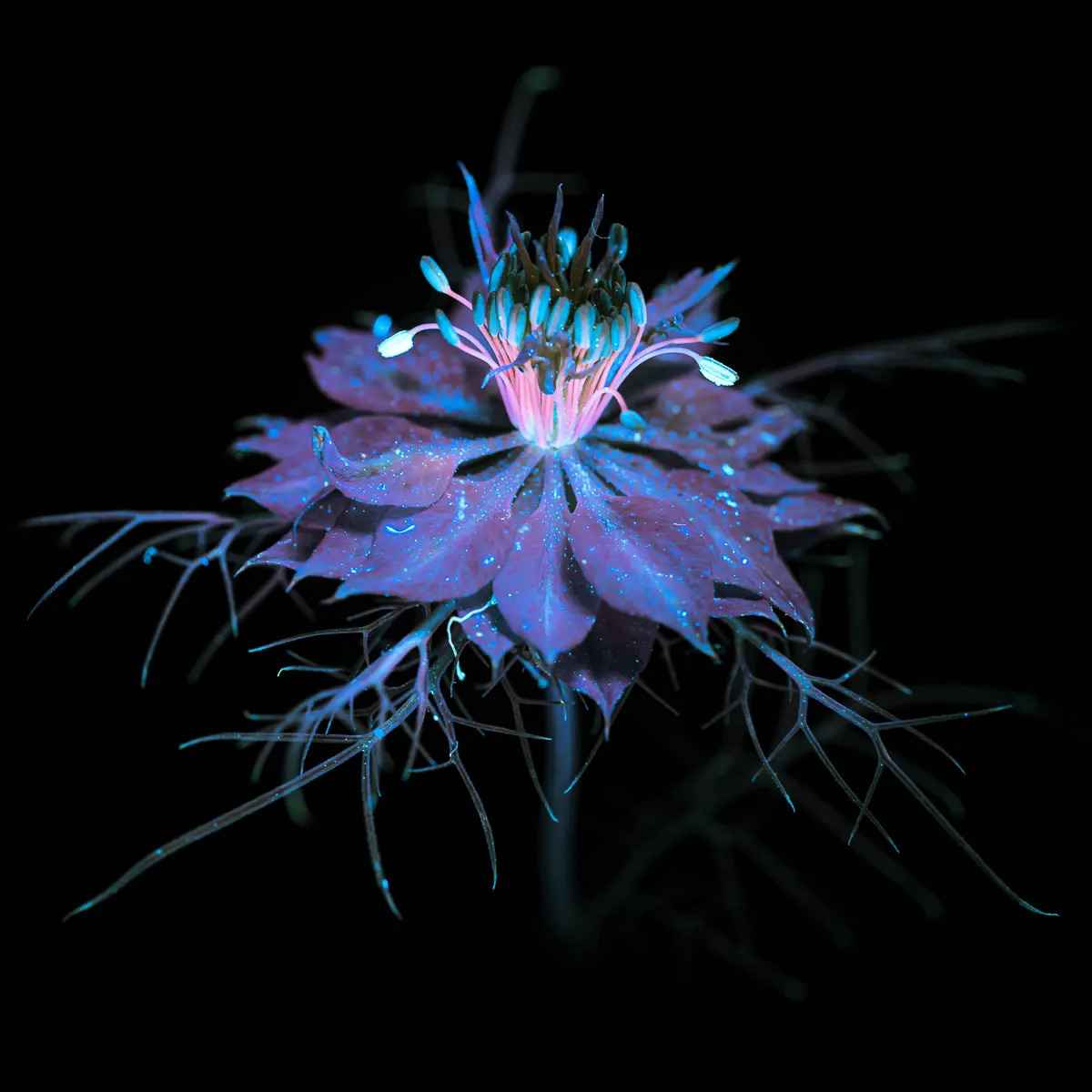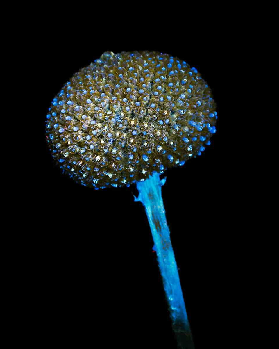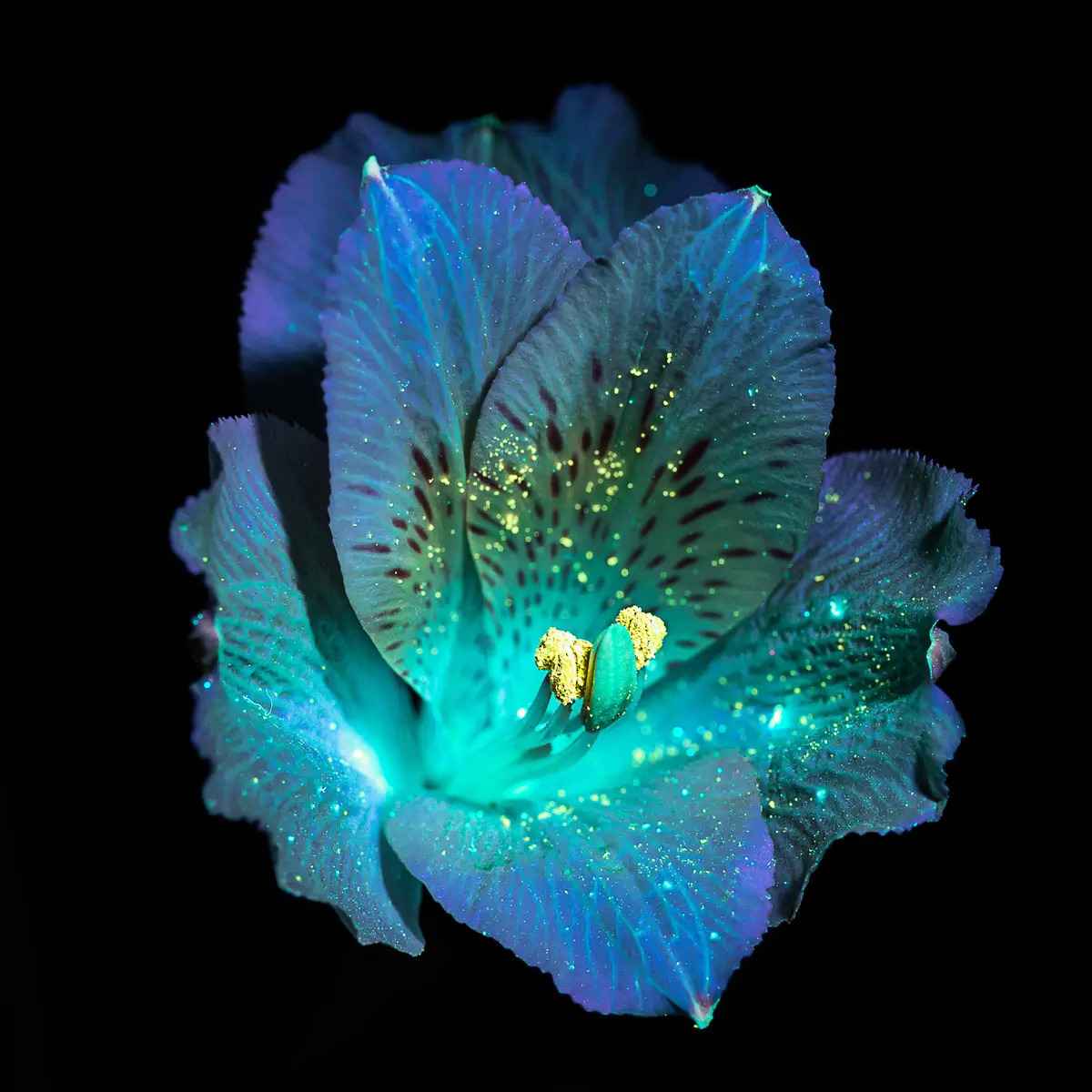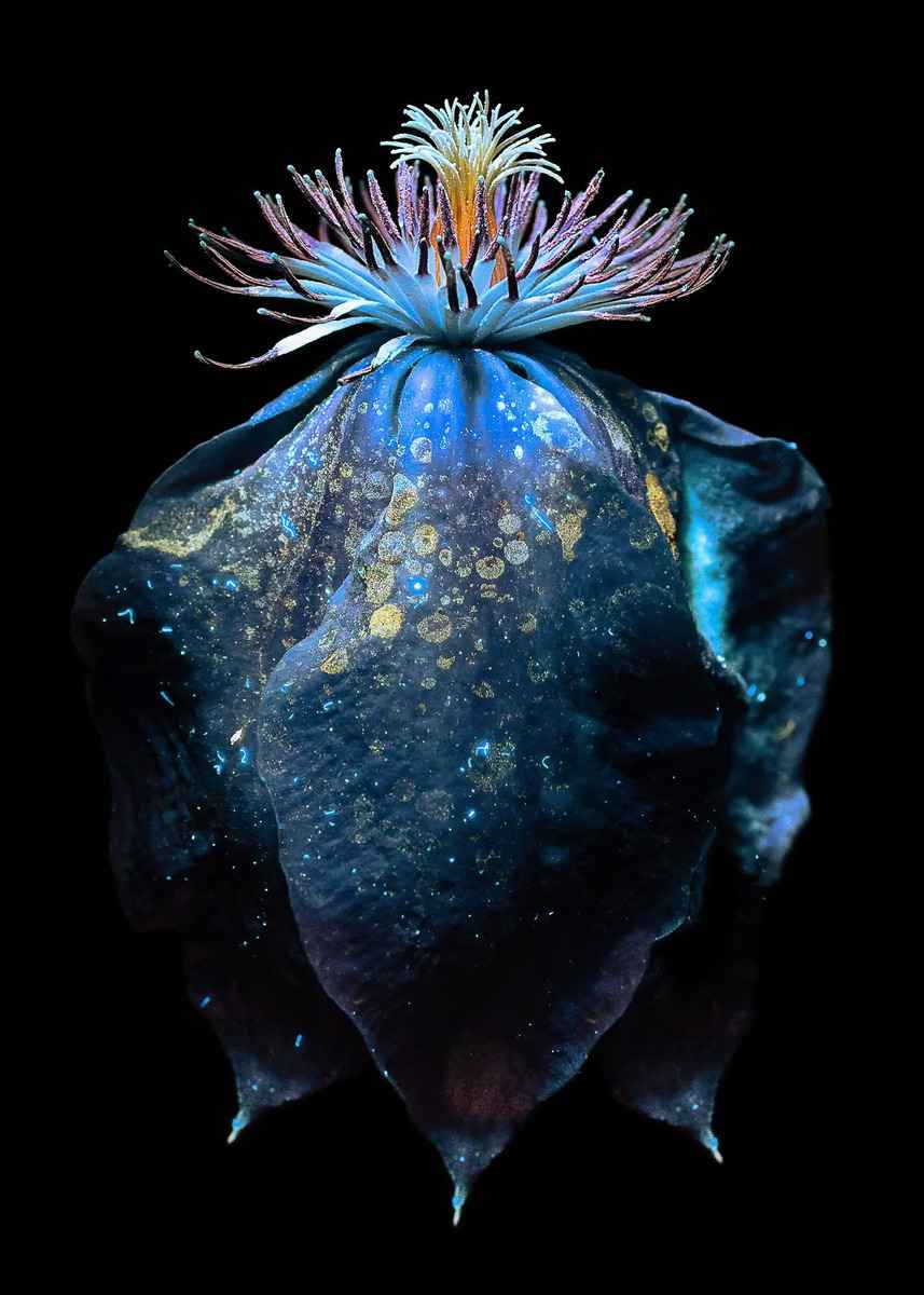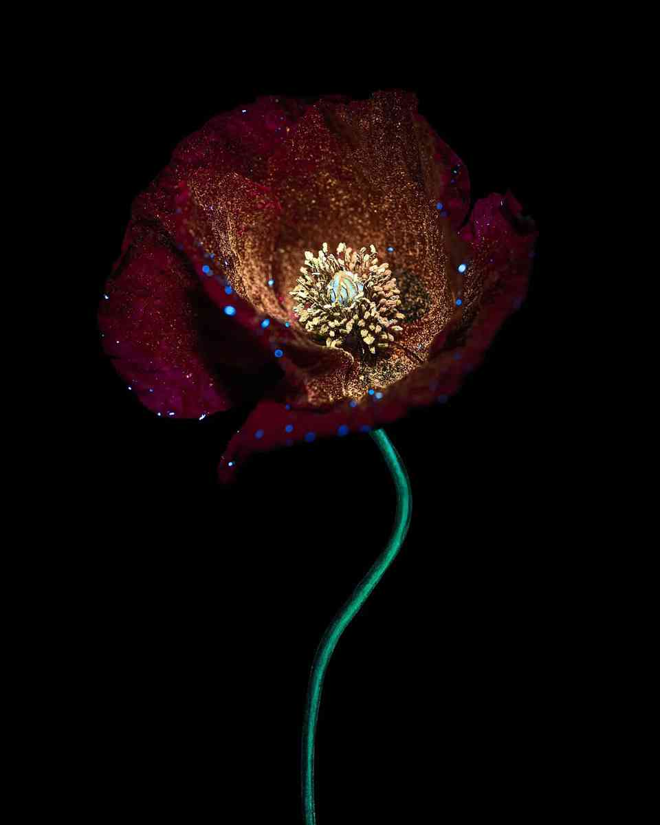 「每個鏡頭都是獨一無二的」,她說,「因為用紫外線手電筒照向花朵時,每次的角度不可能完全一致,而且每次拍攝時的光影效果也不同。」