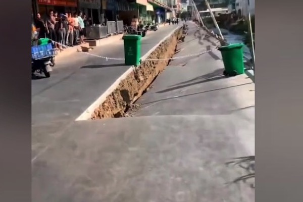 日前網傳一段影片顯示,在廣東汕頭街頭,一段路出現約一米深的塌陷,路燈隨著地面塌陷發生傾斜。該塌陷路面一側是一排店舖,另一側是河流。