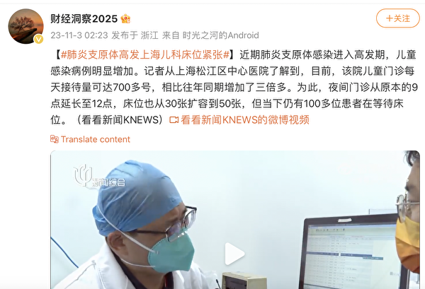 上海郊區的一家疾控中心工作人員向《大紀元》表示,近期確實爆發兒童肺炎。