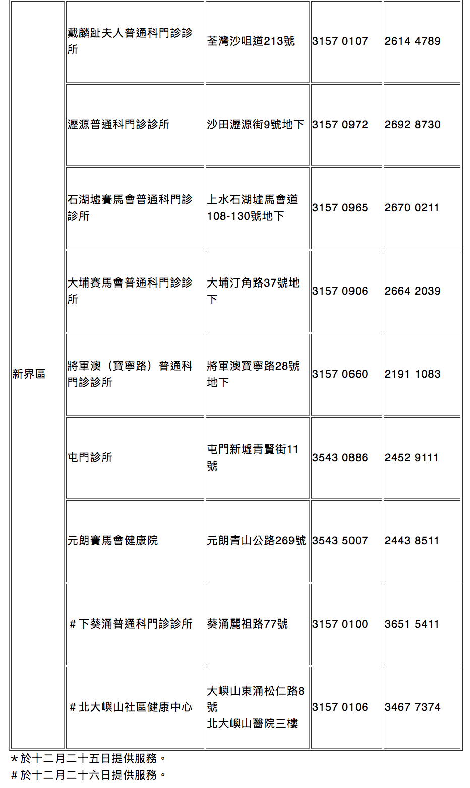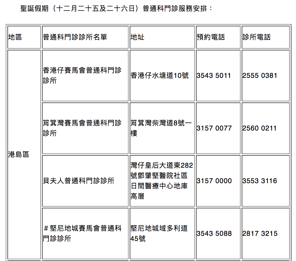 局方指出,近日天氣持續寒冷,流感及其它呼吸道病毒漸趨活躍。為應對市民求診需要及減輕急症室壓力,聖誕節長假期間,會有18間普通科門診診所在公眾假期提供服務。求診人士可透過電話預約系統或流動應用程式「HA Go」內的「預約普通科門診」功能,預約診症。