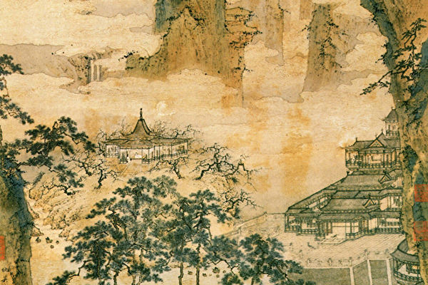 宋劉松年《瑤池獻壽圖》,據《漢武帝內傳》記載,西王母曾往見漢武帝,並贈仙桃四枚。本幅描繪西王母與漢武帝相向對坐交談,眾女仙捧桃實競進,有祥瑞慶壽之寓意。現藏台北故宮博物院。(公有領域)
