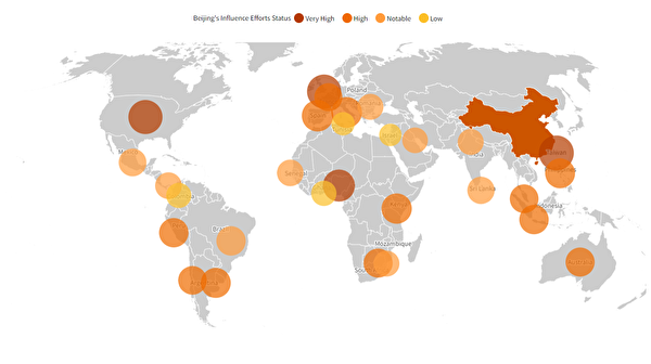 上圖是中共大外宣對各個國家影響力示意圖,顏色越深影響越大(自由之家2022年報告截圖)。2000年初,中共投資數十億美元以開展大外宣工程,在世界各地以多種語言塑造媒體內容及論述;對民主國家常用的手法之一就是所謂的「借船出海」,收購外國媒體公司、保持絕對控股權或持有部份外媒股權或與外媒內容共享,通過外媒間接傳播中共聲音;現在中共的重點主要集中在非洲、亞洲和拉丁美洲,尤其在非洲提供數碼電視及網絡服務。