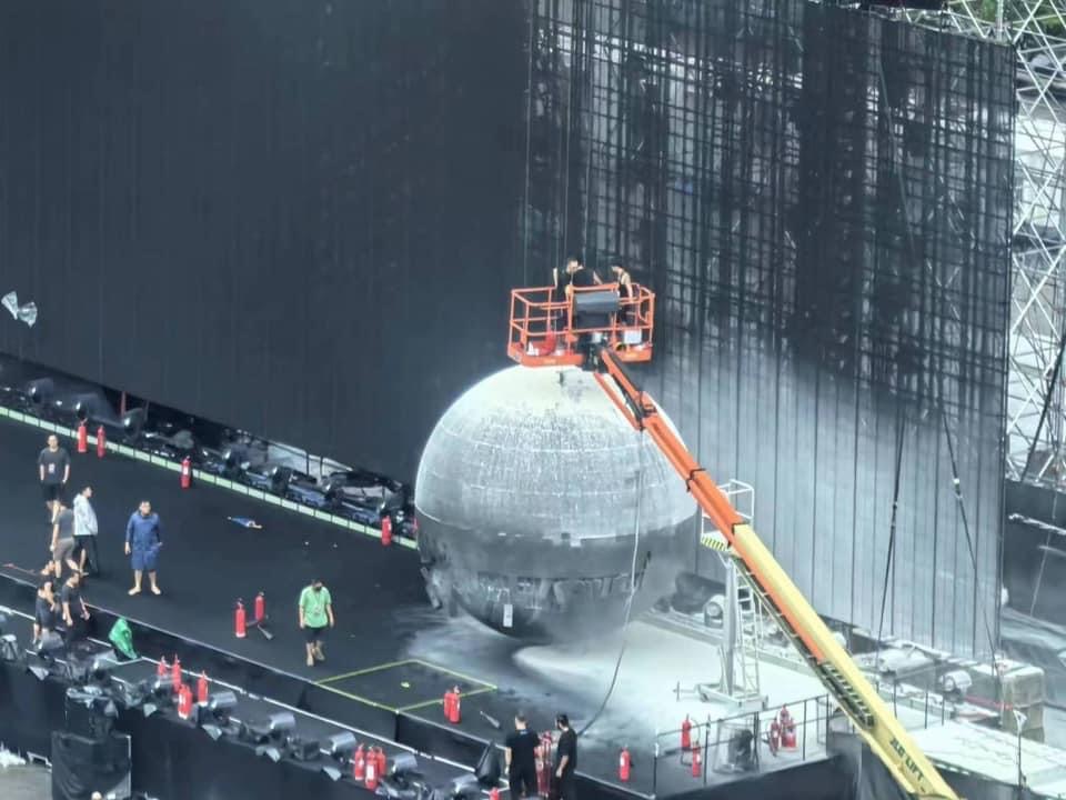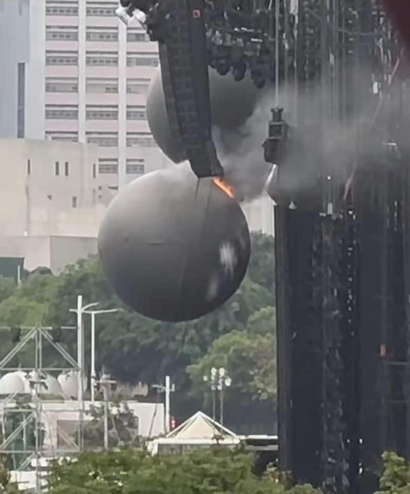 台灣樂團「五月天」於中環海濱的戶外演唱會,昨晚因暴雨而腰斬,舞台今(1日)午有裝飾一度起火冒煙。警方在下午約2時半接報,指現場有球型裝飾著火,其後已救熄。@
