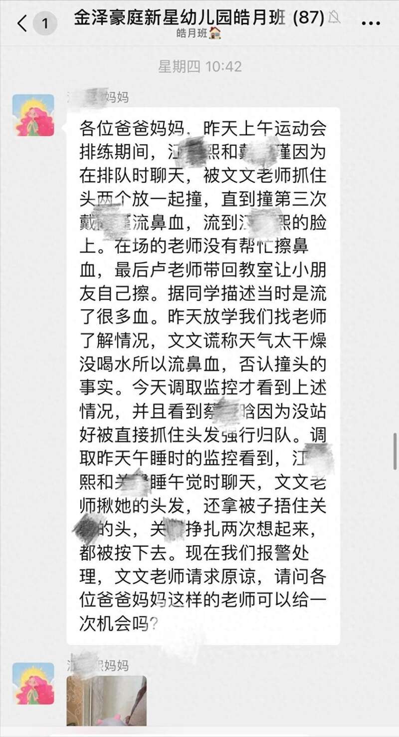 華商報大風新聞報道,群名為「金澤豪庭新星幼兒園皓月班」的群聊顯示,家長在群內發言稱,兩名孩子因在運動會排練期間相互說話,某老師抓住兩孩子的頭互撞,其中一名孩子流鼻血。一名家長表示,放學後找涉事老師了解情況,她謊稱天氣乾燥沒喝水所以流鼻血,否認傷害孩子的事,轉天調取監控才看到真實情況。