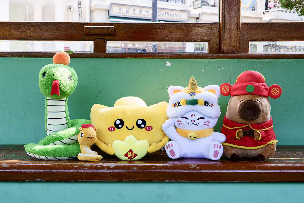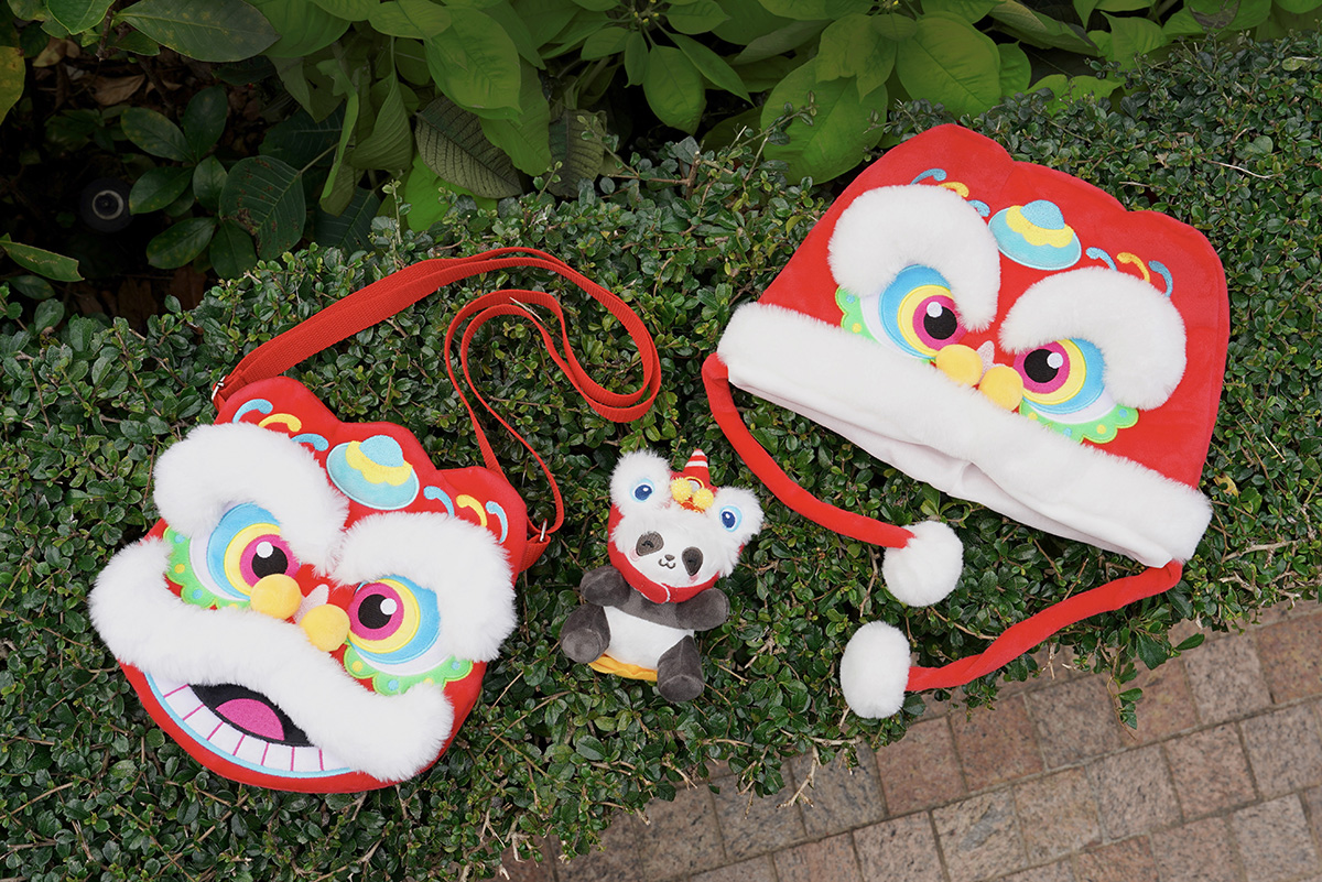 節慶紀念品方面,包括新年舞獅熊貓肩膊公仔、醒獅帽和醒獅毛絨小袋子。還有Ocean Park X Studio 7 Days全新新年版熊貓裝飾瓶,包括招福家姐、千萬両細佬和求籤版盈盈3種可愛款式。多款新春限定的迎春接福公仔獎品,包括醒獅招財貓、大小金元寶、蛇年大吉和蛇仔肩膊公仔已登陸園內的遊戲攤位。