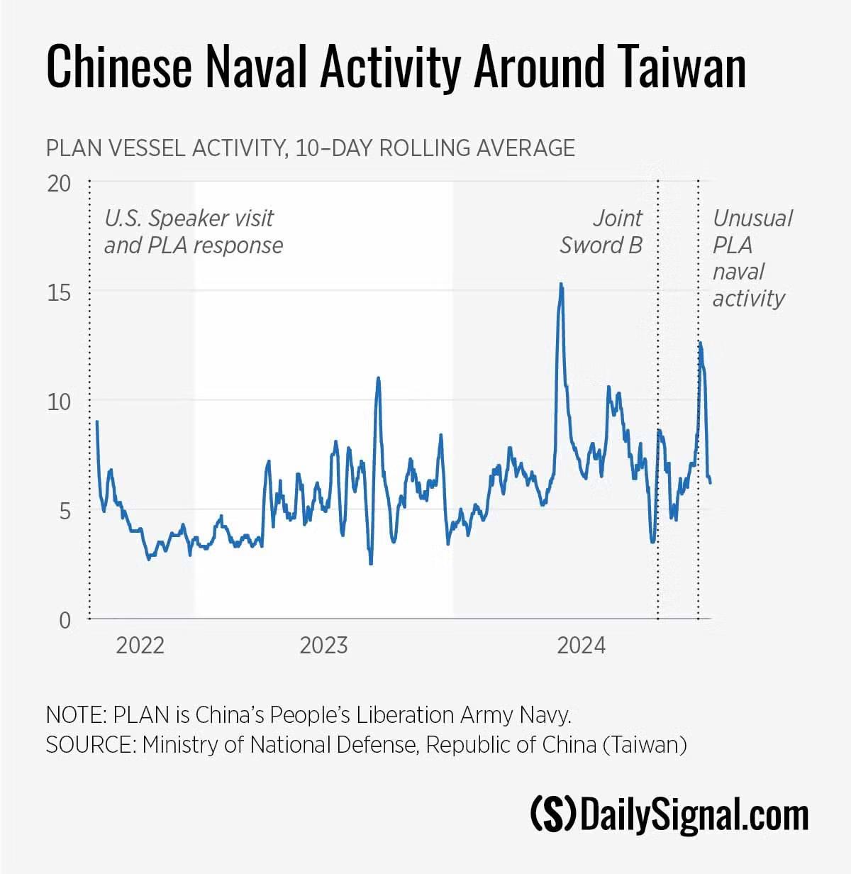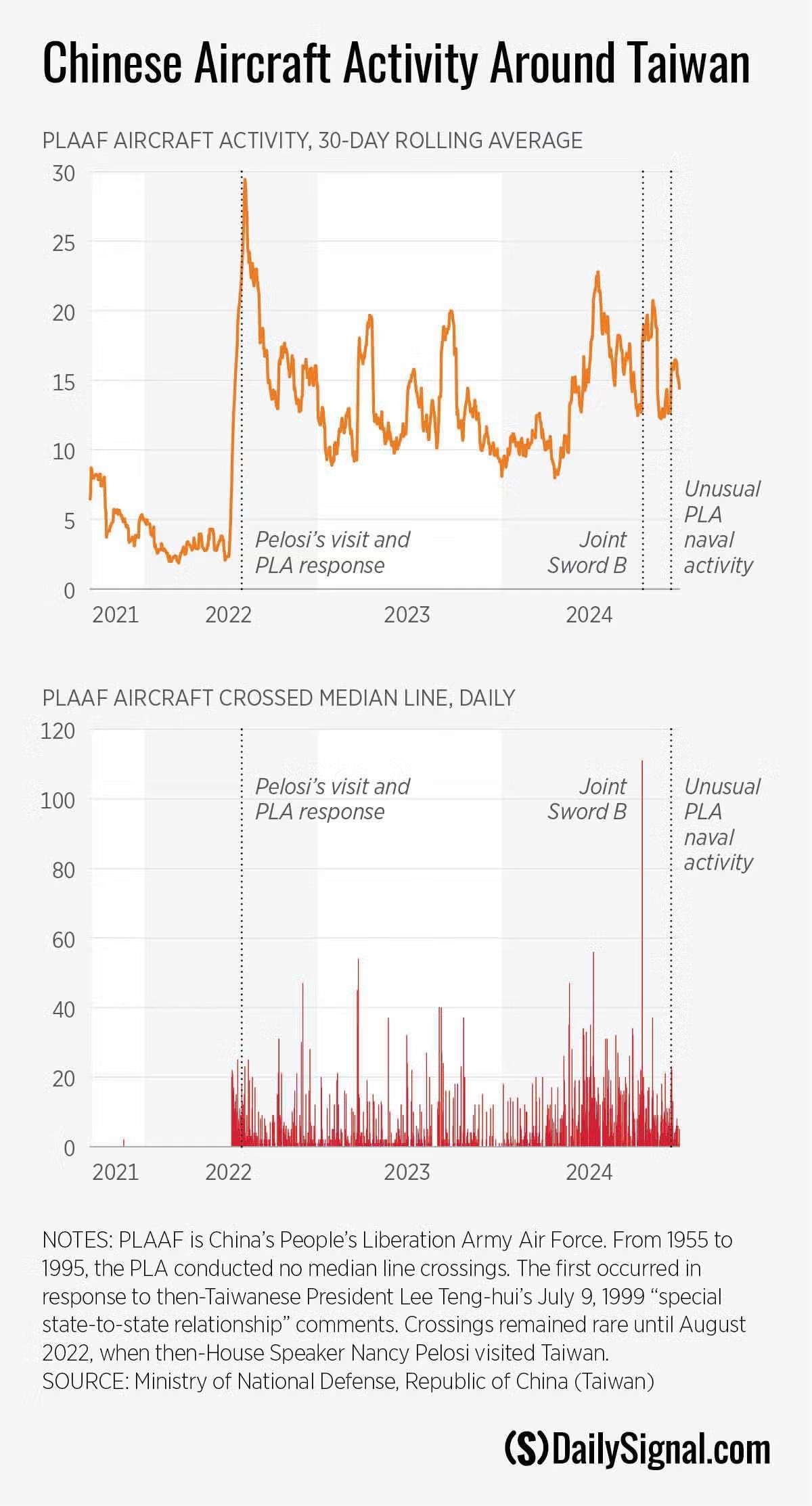 雖然2024年之前,中共軍隊的挑釁活動一直居高不下,然而10月份才是有史以來規模最大的單日軍事示威。