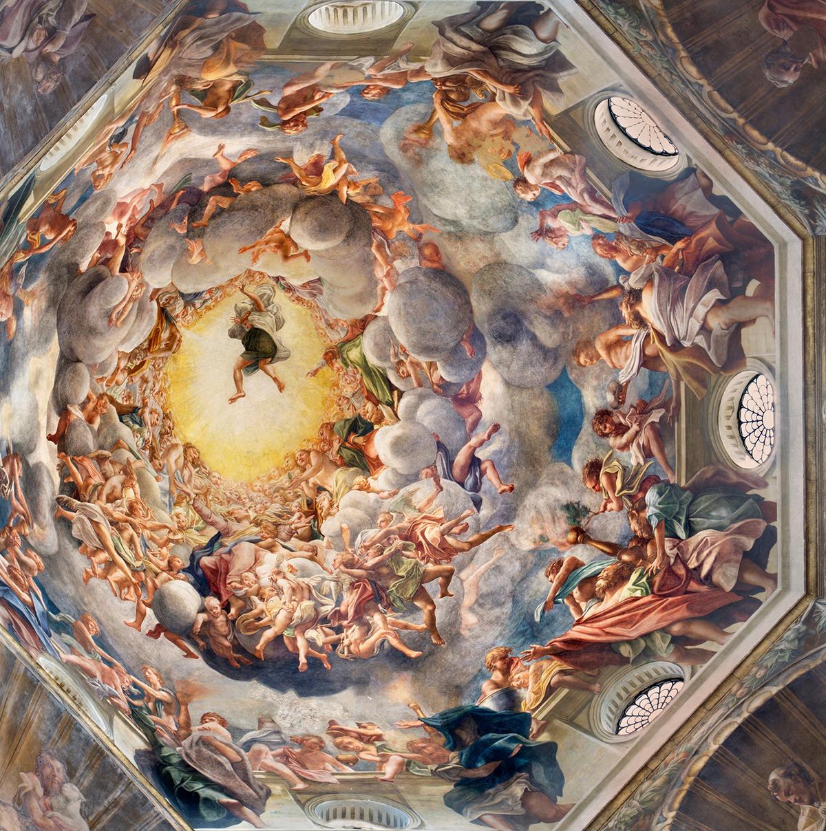 頭頂上描繪的情景是聖母瑪利亞升天。柯勒喬將她繪製在圓頂的西側,不是中央,這樣到訪者就可以從中殿通往祭壇的樓梯上看到她。瑪利亞穿著粉紅色的長袍和藍色的斗篷;身處光彩奪目,四周都是天使、小天使和雲朵看似無限延伸的螺旋當中。