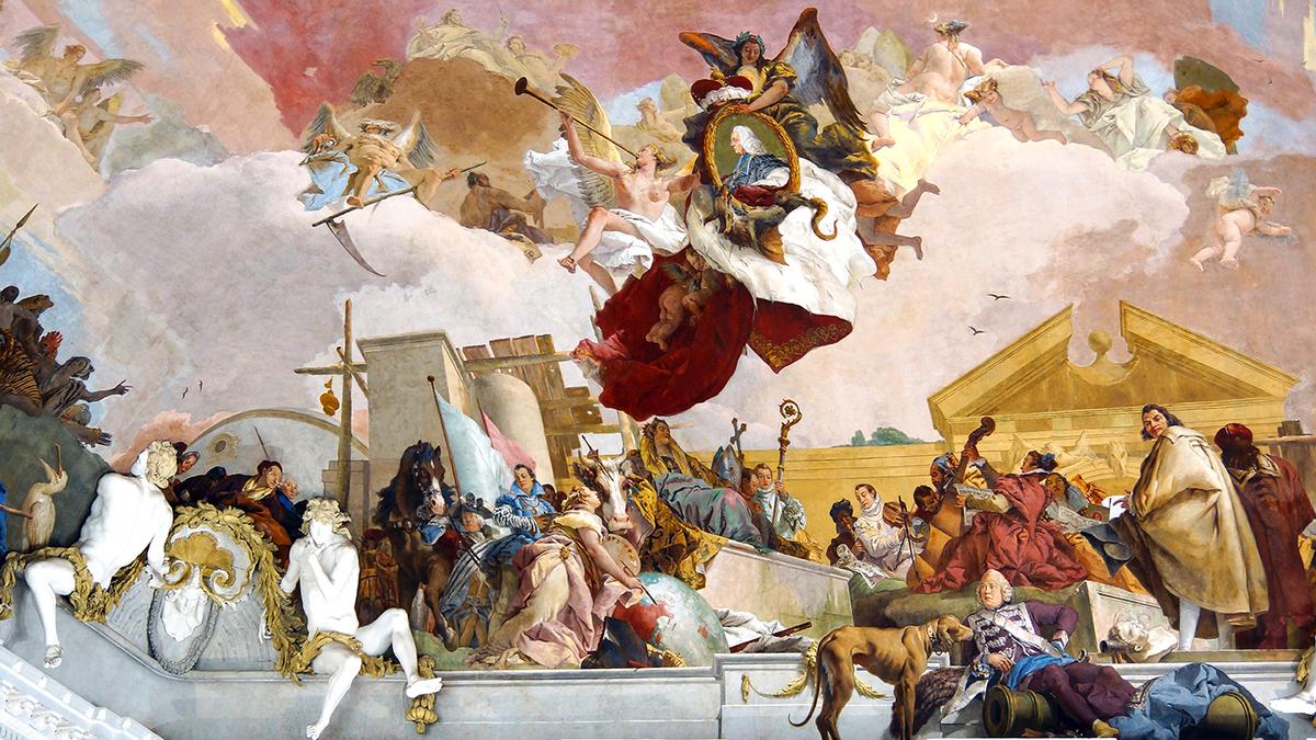 這幅壁畫結合了神話和當時的政治。提埃坡羅和柯勒喬一樣一絲不苟,規劃多個視點,考慮到了遊客爬上樓梯觀賞的過程。中心是廣闊、戲劇性的天空,由奧林帕斯眾神主演。太陽與藝術之神阿波羅正準備駕駛日行戰車為世界帶來光明。提埃坡羅的構圖是一個寓言,將阿波羅比喻為王公主教。時間(The Hours)化身成帶著蝴蝶翅膀的女性人物,走在馬匹前引領阿波羅,小天使推著金黃色戰車穿過雲層。此外,在場的其他眾神還包括眾神之王朱比特、戰神馬爾斯、使者墨丘利(Mercury)和愛神維納斯。