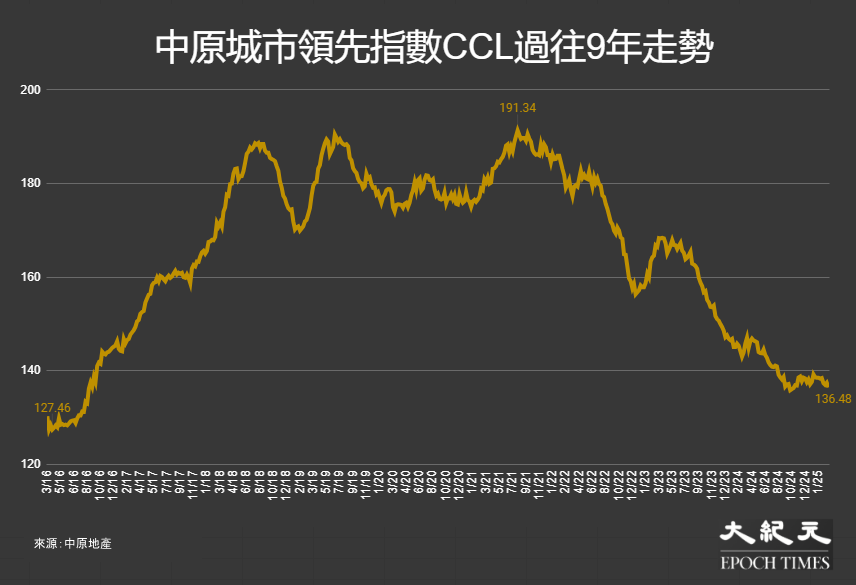 追蹤香港二手樓價的中原城市領先指數CCL於14日公布最新的數值為136.48點,截至3月9日,按周指數下降0.71%,按月則跌1.44%,自疫情爆發以來(2020年1月26日起)跌23.14%,而3年的累積跌幅為24.12%。大型、中小型單位按周分別錄得下降0.57%、下降0.74%,3年累積跌23.80%、跌24.20%。