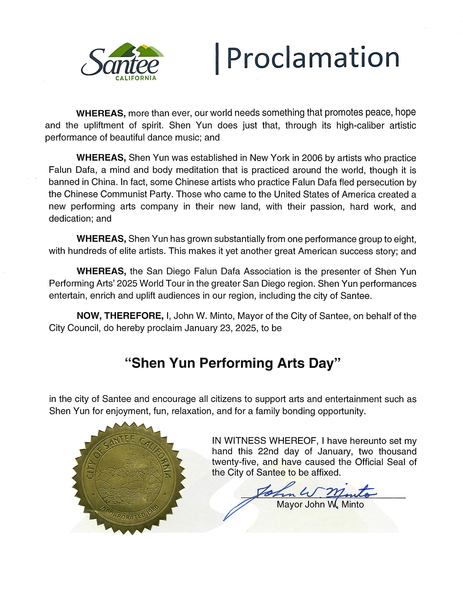 桑提市(Santee)市長John Minto在代表城市和市議會的褒獎中寫道,這個世界比以往任何時候都更需要能夠促進和平、希望和提升身心的事物。神韻藝術團正是透過其高水準的藝術演出和優美的舞蹈音樂做到了這一點。
