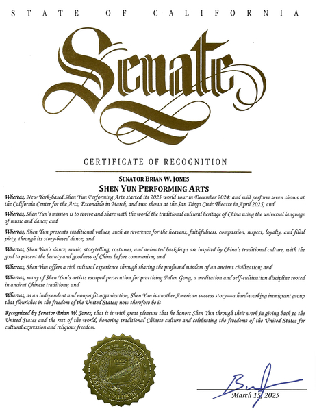 2025年神韻巡演將在加州大聖地牙哥地區舉行九場演出。加州參議員Brian Jones為神韻藝術團頒發褒獎。(大紀元)