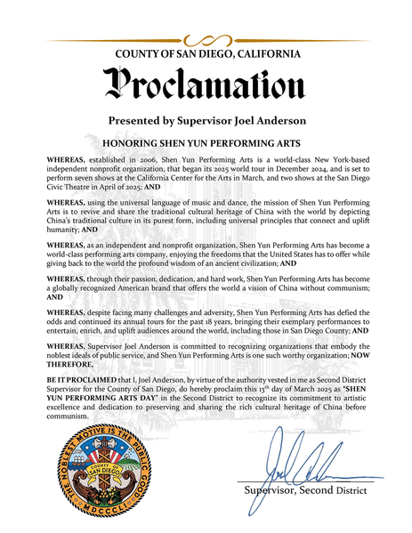 聖地牙哥縣監事會監事Joel Anderson在褒獎中寫道:神韻藝術團利用音樂和舞蹈,復興並與世界分享中國的傳統文化,通過展現最純粹的中國傳統文化,呈現連接並提升人類的普世原則。
