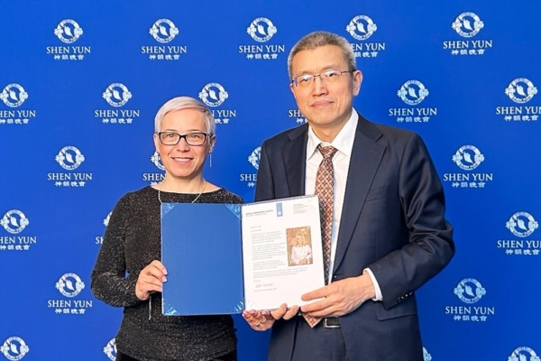 2025年3月21日晚,神韻新紀元藝術團在加拿大密西沙加表演藝術中心的首場演出,安省長期護理廳廳長辦公室主任Beate Cieslak-Szewczyk受廳長委派到演出現場向神韻主辦方頒發賀信。(滕冬育/大紀元)