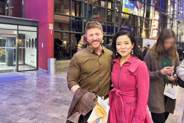 2025年3月21日晚,模特Lavender Mai與友人James Rigg一起觀看了神韻新紀元藝術團在加拿大密西沙加表演藝術中心的首場演出。(滕冬育/大紀元)
